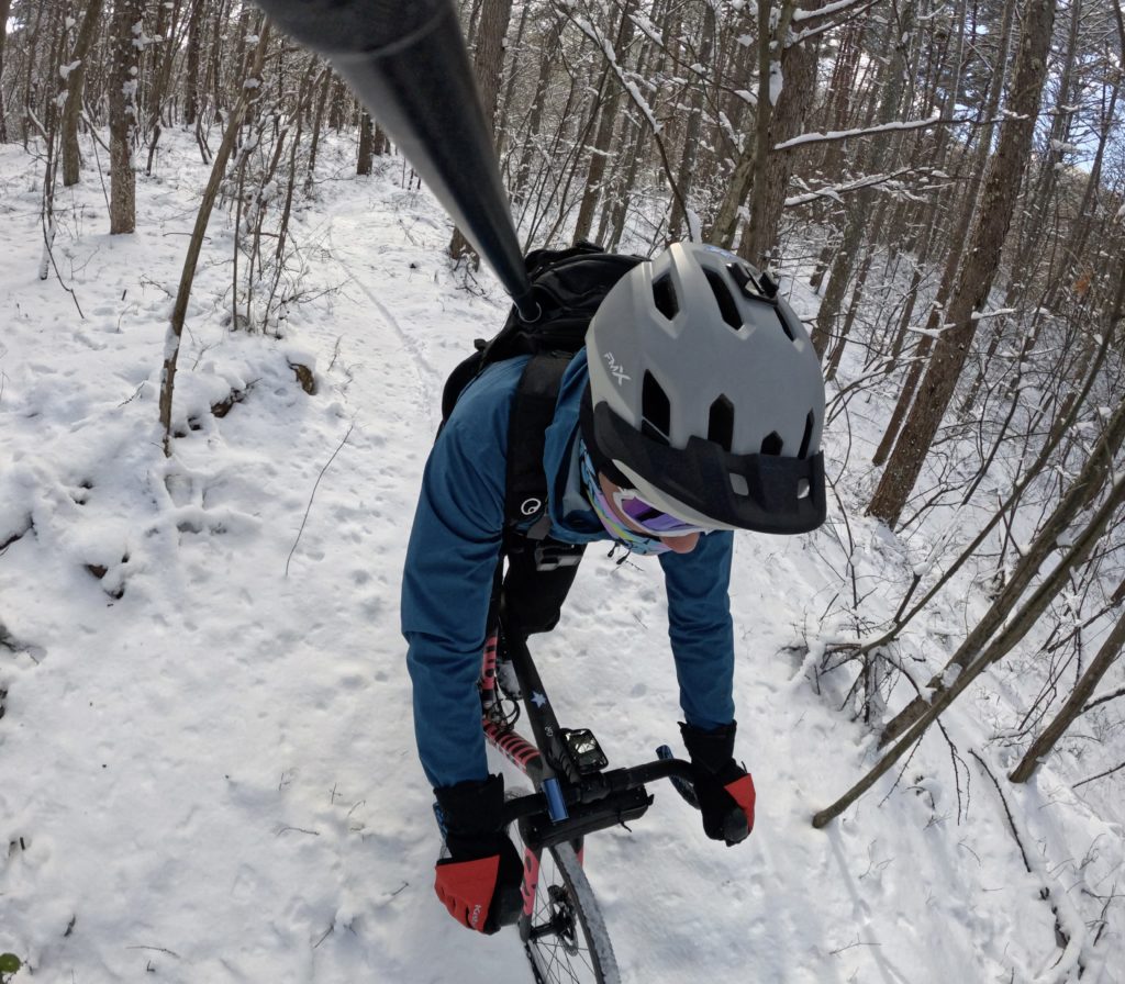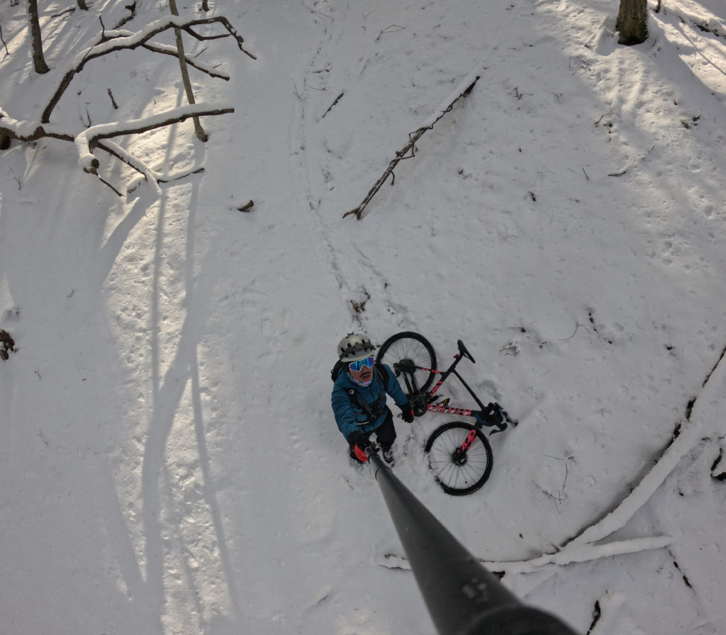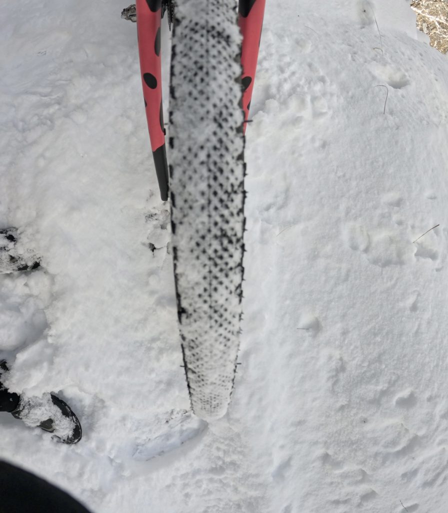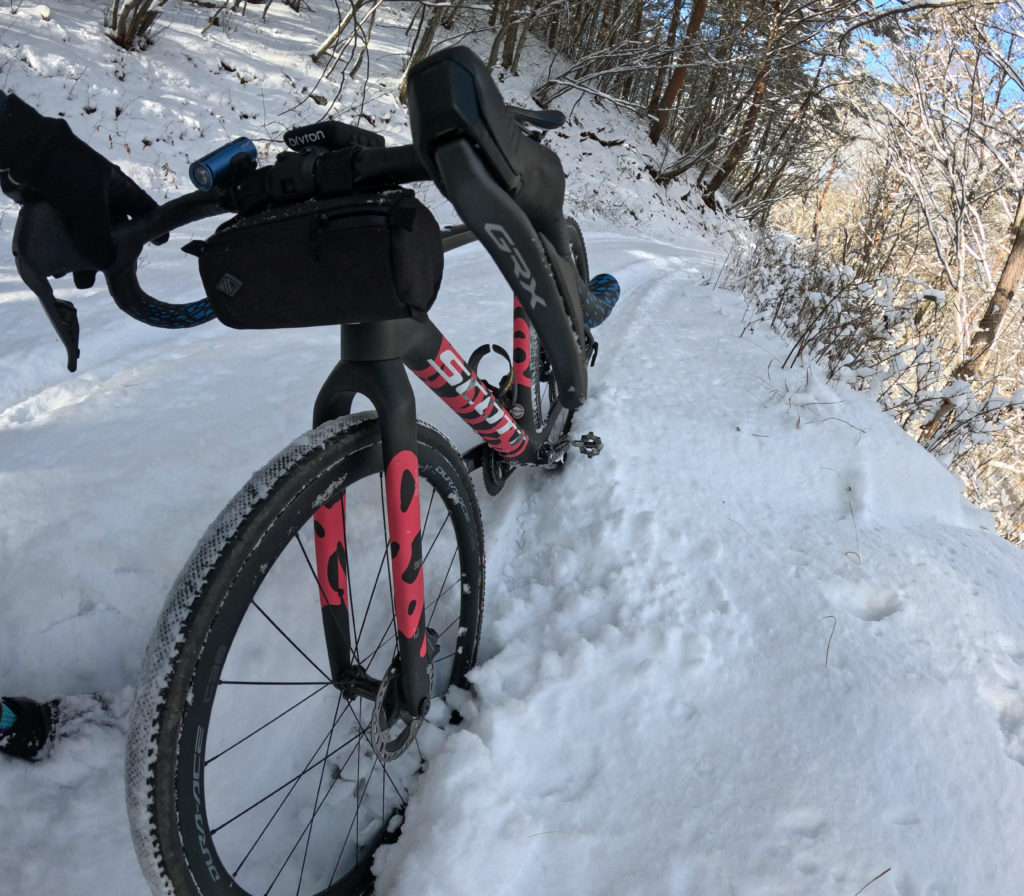とは言っても、前日は普通に乗れたけど本日はどうも違う様子だ。通常の1時間半ルートを行けば行けるか!そんなノリでしたが、車が通行していた様子でファーストトラックできず、そのタイヤ痕で下地が氷で雪が乗るのでスリップしてその先はいけず。かろうじて砂利道が進めたけど当初予定のルートから登坂は4ぶんのいちで終了。トレイルをアクセスするルートで走ってきました。